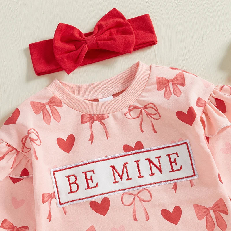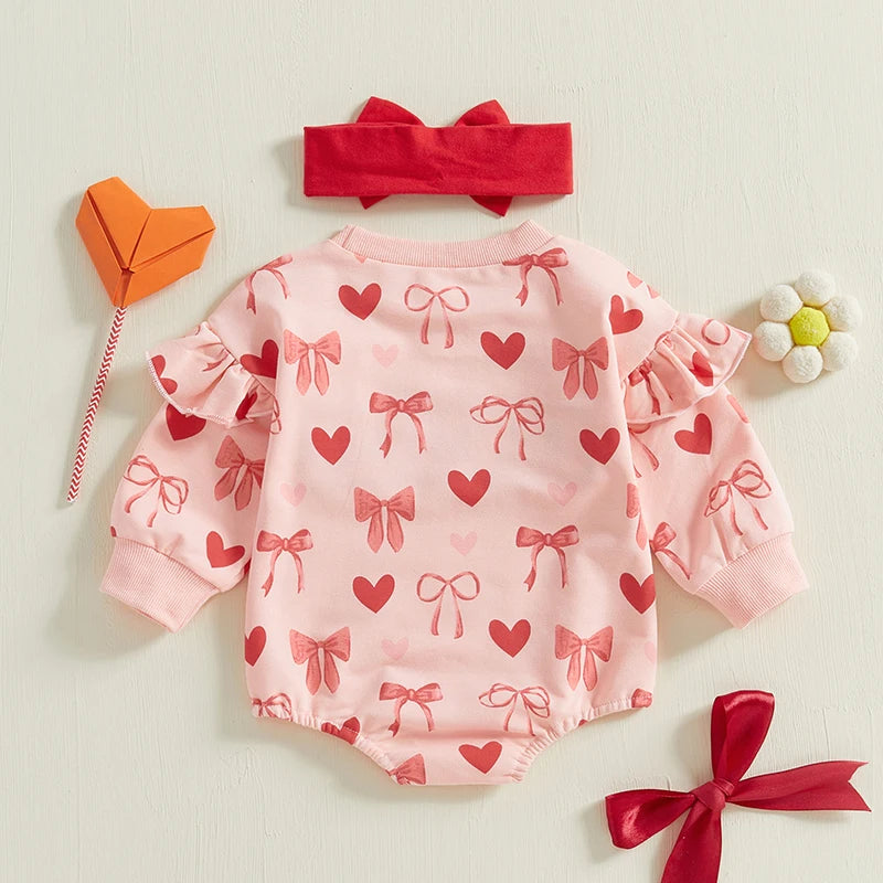 Adorable Matching Set – Heart and bow print romper paired with a cute headband creates an effortlessly charming look.